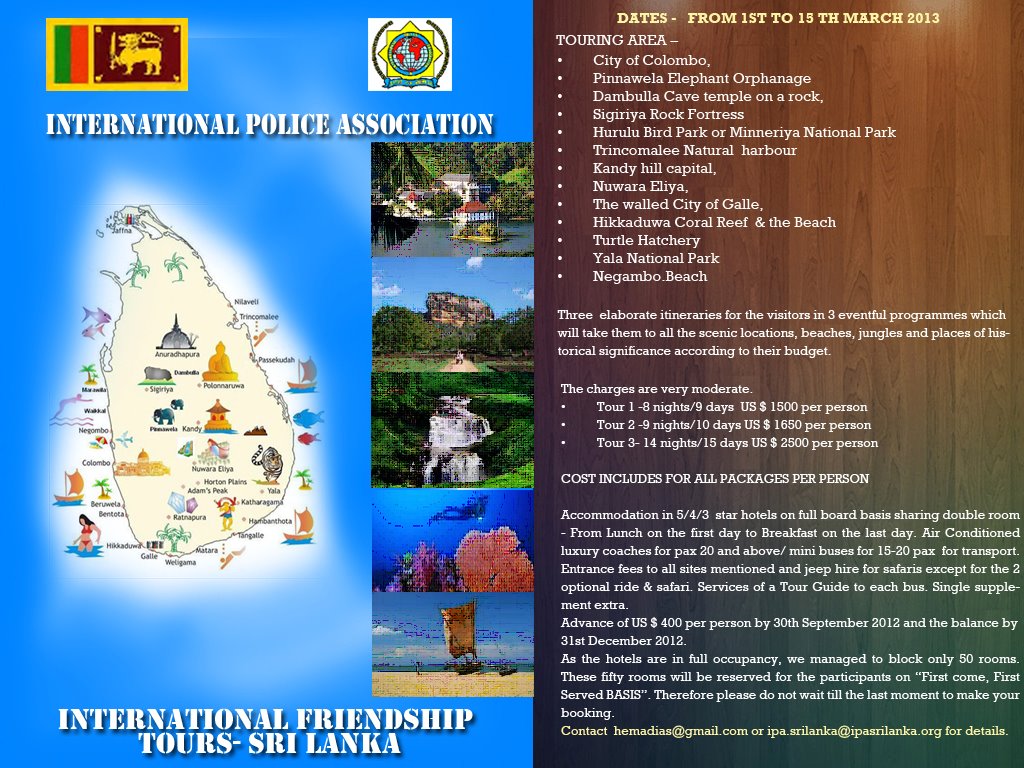 IPA Sri Lanka osakond ootab pikisilmi, et võõrustada oma vendi, õdesid, nende perekondi ja sõpru, meie sõpruseringreisil. Oleme koostanud kolm marsruuti külastajatele kolme sündmusterohke programmiga, mis viivad teid imelistesse kohtades, randadele, džunglisse ja ajaloolistesse paikadesse, vastavalt teie eelarvele. Seekord oleme põhiliselt planeerinud reisi saare idarannikule, mis vabastati terroristidest 30 aastat tagasi. Trincomalee sadam on üks suurimaid ja ohutumaid looduslike sadamaid maailmas. Seal on päikesepaisteline ilm aastaringselt, valged liivarannad, vaikne, rahulik ja soe vesi. Ideaalne veealusteks tegevusteks ja vaalade vaatluseks.